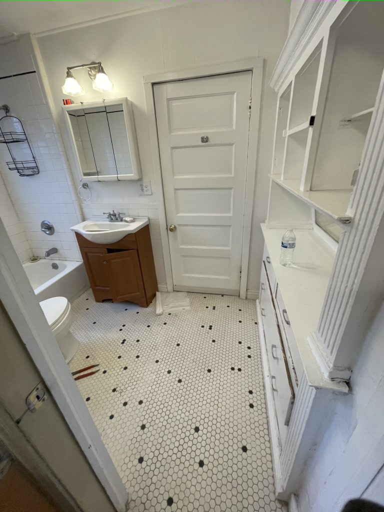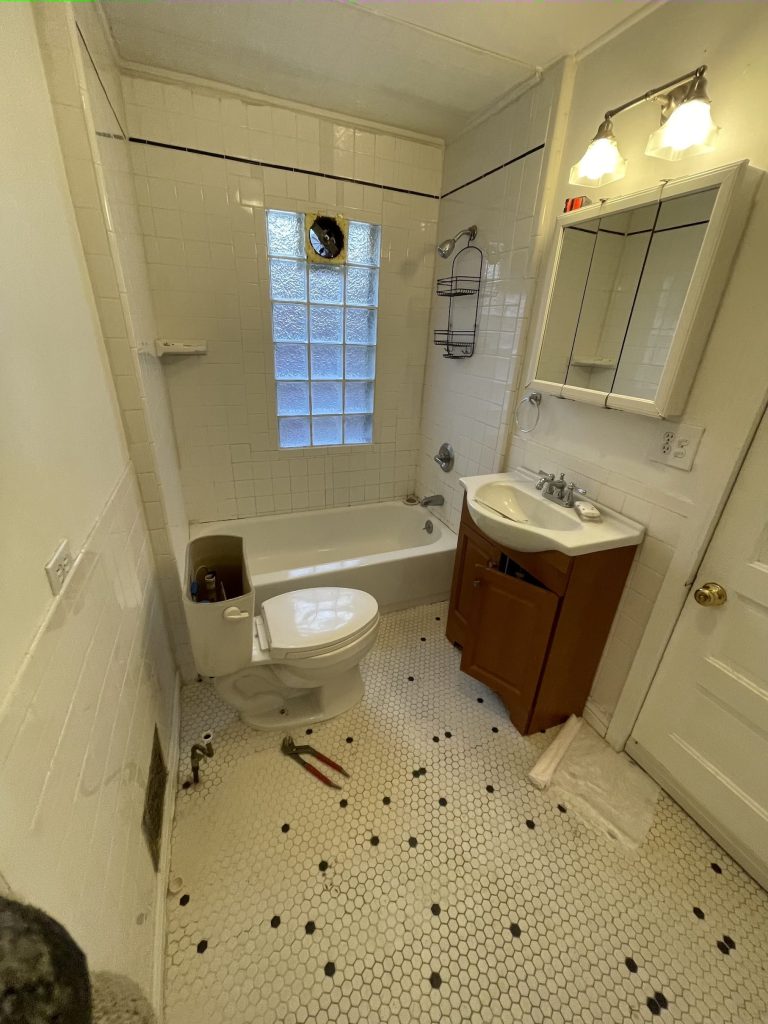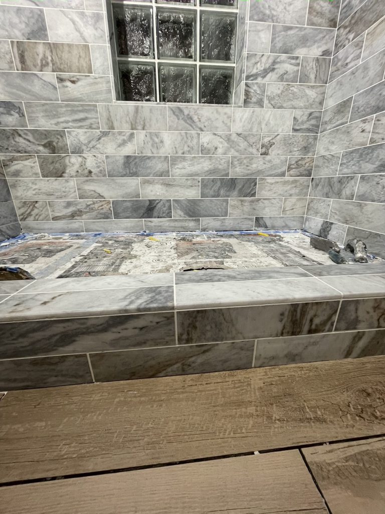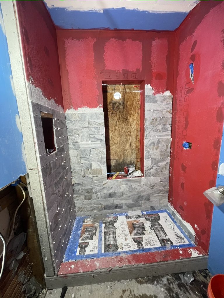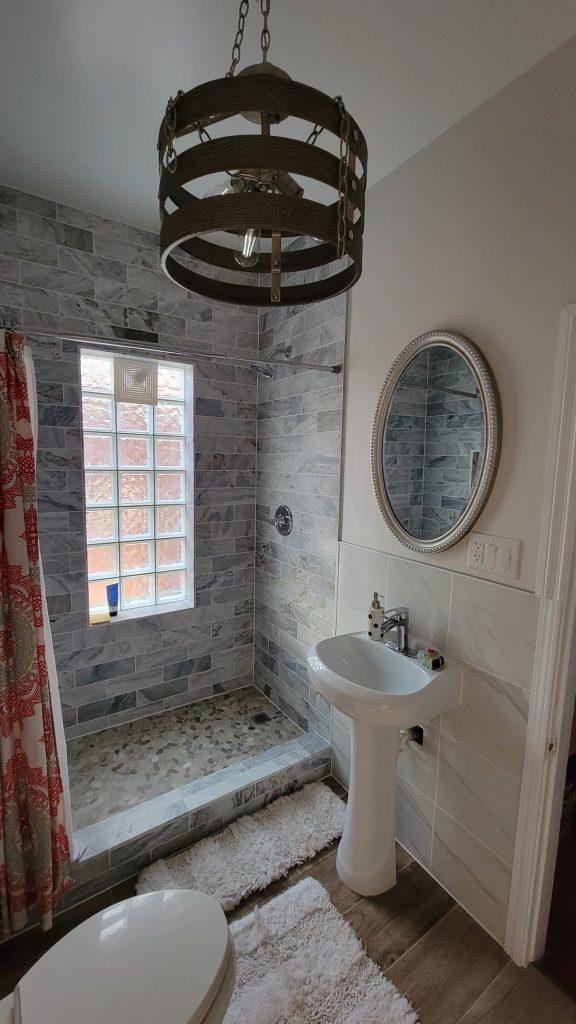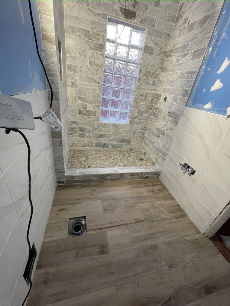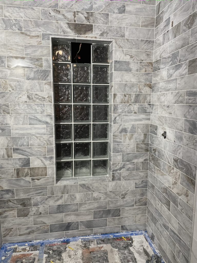 Bathroom Removal of old shower bathtub & pour new custom-sized shower concrete base with step & installation of glass block. Installation included new plumbing fixtures, tile floor, walls framing, drywall work, electrical work- new three-way switch instead of regular switch & additional outlet & fan.